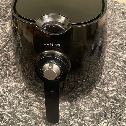 Philips Airfryer sort fritøse med svart finish. Kompakt design med uttrekkbar kurv for enkel rengjøring. Strømledning festet bak. Egnet for tilberedning av mat med lite eller ingen olje.