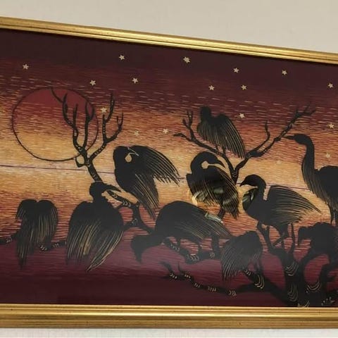 Stort silkesjal innrammet. Ca 105*105 cm.