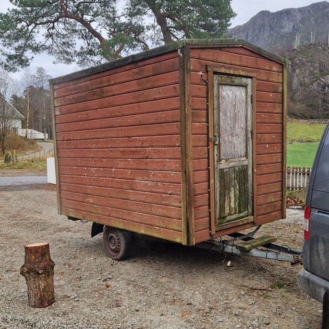 Gamel hvilebrakke på meier gis bort da tiden ikke strekker til, tak begynt å gi seg. Bakvegg ved vindu har råte i seg. Ikke umulig å sette istand men må påberegnes en go del jobb, må nok ta vegger å tak,gulv ser bra ut. Følger med et sett breiere meier, tror det er Bredesen Opset på Kirkenær som har bygd den. Hentet den selv på biltralle å det gikk bra. Må hentes.