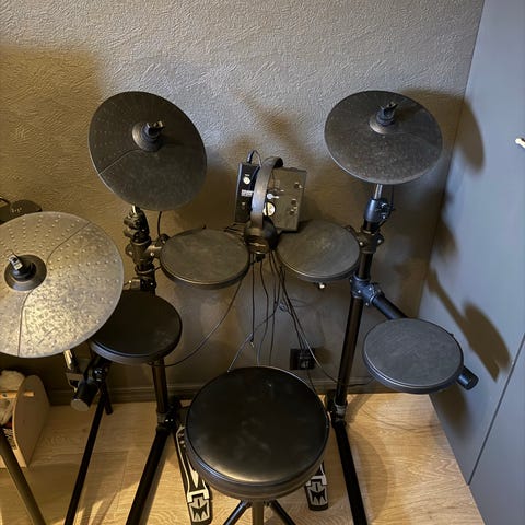 Bassforsterker som kan kobles til trommesettet selges separat. Se finn annonse: https://www.finn.no/recommerce/forsale/item/435196298