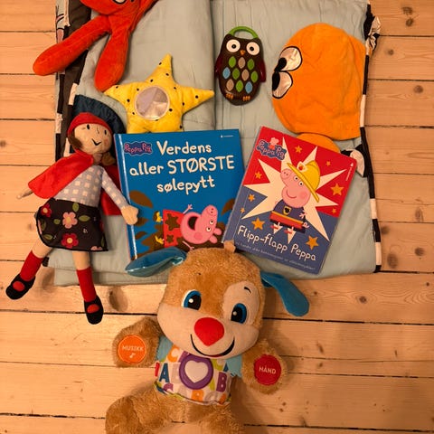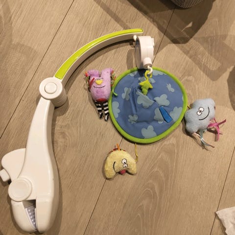 IKEA Barneleketøy hengende babyleke laget av stoff i flere farger. Passer for babyer og små barn, designet for å festes over en barneseng eller lekeområde for visuell stimulering.