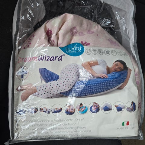 En blå bæretube str. S (https://www.kamcaredesign.se/bartub/bartub-1). Såvidt litt nuppete etter vask. God bærekvalitet, sitter tett. Fire ammeinnlegg i ull, nesten ikke brukt. Fremstår ny. To ammeinnlegg i økologisk bomull, noe nuppete. Det ene har to flekker på baksiden. Kan hende den går bort med sitronsåpe eller flekkfjerner.