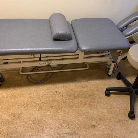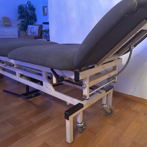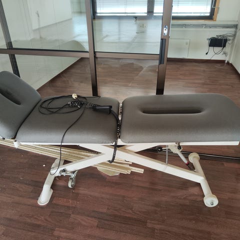 Follo Industrier FX-TABLE behandlingsbenk med elektrisk justering. Benken har blå polstring og en ramme i metall. Polstringen har et slitt punkt som du kan se på bildene. Motor har vært ødelagt men er reparert og fungerer godt. Har to hjul som gjør forflytning enklere. Må hentes.