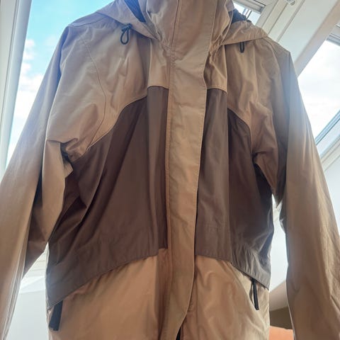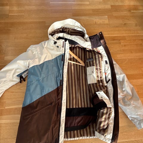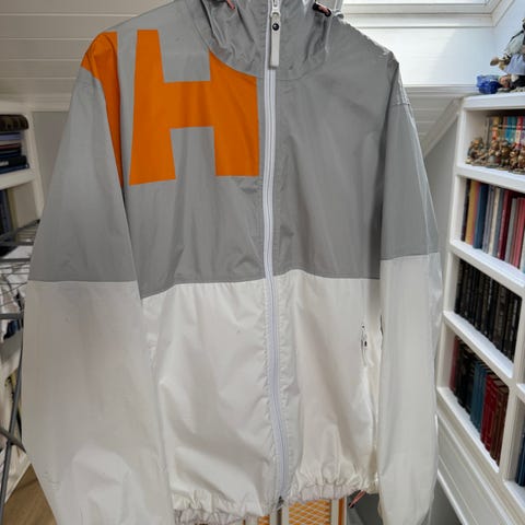 Helly Hansen jakke i størrelse L, farge hvit med brune detaljer. Jakken viser tegn til bruk med noen synlige merker.