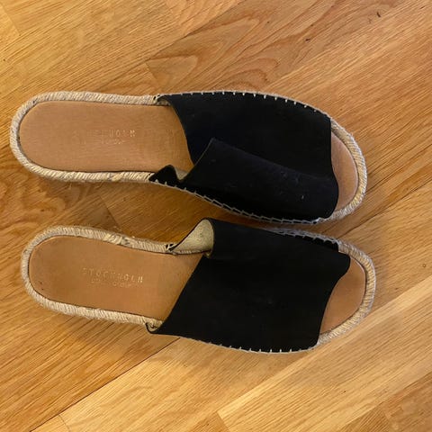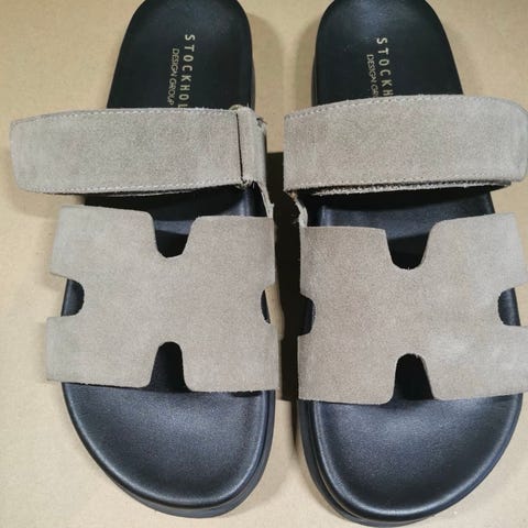 Stockholm Design Group sandaler for dame i størrelse 39. Sandalene er svarte og laget i skinnmateriale. Designet med åpen tå og flat såle, egnet for bruk i varme værforhold.