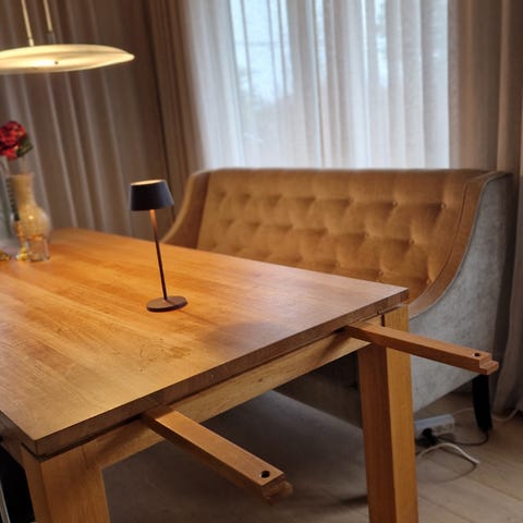Solid benk til fransk spisekøkken. Ser ubrukt ut. Vi har fått sydd en tilpasset blå pute til benken. Den følger med.