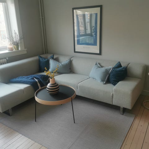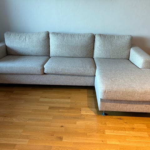 Deilig sofa, 3 seter med sjeselong til høyre, sjeselong er 150 cm dyp og 82 cm bred. Sofaen er i to deler for enklere transport. Det er et lite rift i filten på sjeselongen, se bilde.