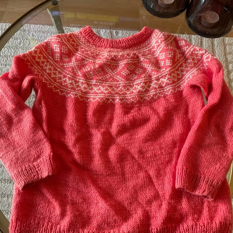 Lite brukt hjemmestrikket genser i nydelig fargekombinasjon🧡 modellen heter «Karusellgenser» og er laget i mykt og litt tynnere garn i ullblanding. Passer str 116-122 (dvs seks år i følge oppskriften)