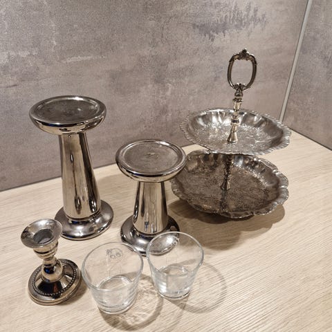 Diverse fat, vaser, lysestaker i tinn