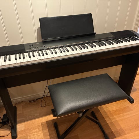 Casio PX-150 digital piano med 88 tangenter og svart utførelse. Inkluderer tre pedaler, et justerbart sete og et sort stand til pianoet.