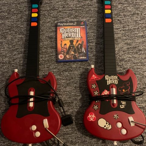 Red Octane Guitar Hero Gitarre Elektronisk Spillkontroller i svart farge. Inkluderer kabel for tilkobling, med fargerike knapper på gripebrettet. Designet for bruk med Guitar Hero-spill, med skulderrem for bæring. Laget av plastmateriale.