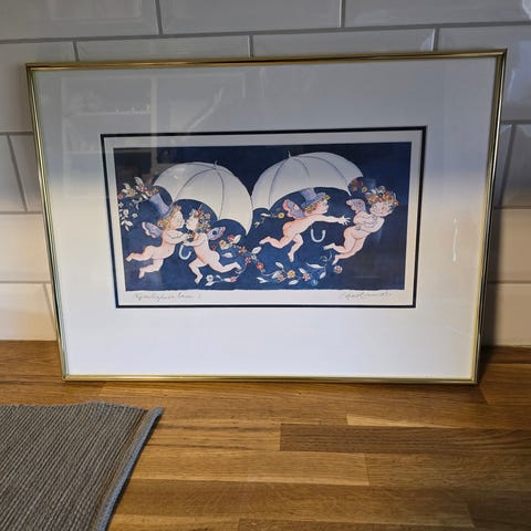 Vintage kunstverk i ramme og glass.