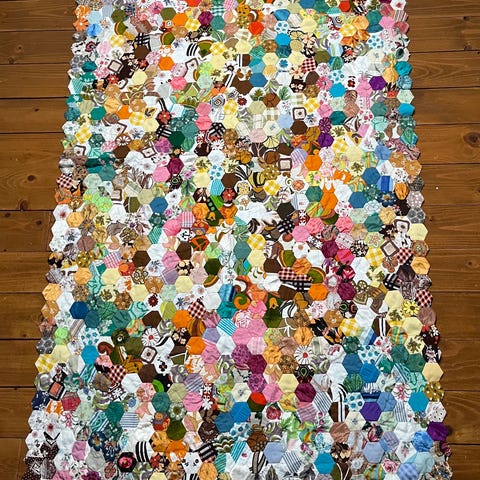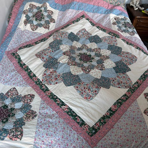 Patchwork, lappeteknikk, quiltet teppe i grønntoner fra 90-tallet