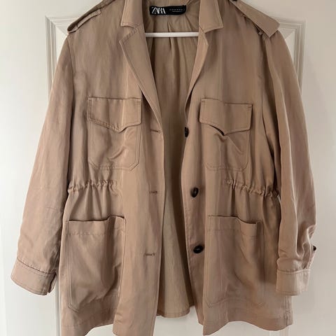 Superfin jakke fra Zara, som knapt er brukt. Fargen er mørk grønn/brun. Bak har den en fold, som gir den en A-fasong. Kord på kragen.