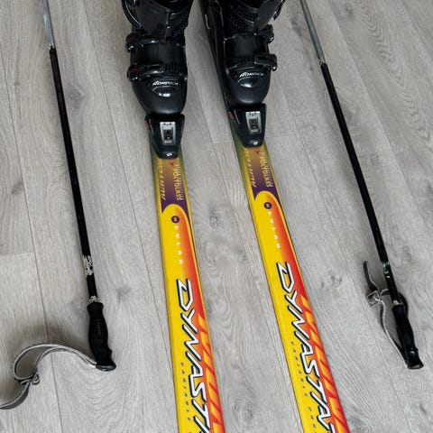 Åsnes V20 med bindinger og tilhørende skistøvler, Scarpa T3 str 8,5-9 i svart farge. Skiene har et fargerikt mønster i rødt, oransje og svart. Støvlene har justerbare spenner og er designet for å passe sammen med bindingene på skiene.