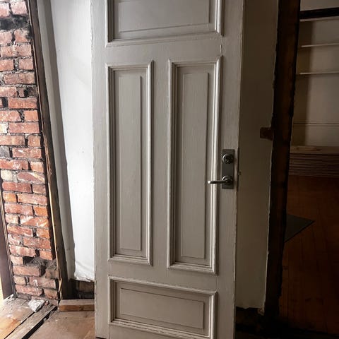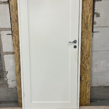 Døren har hull for lås og håndtak, og beslag for montering. Passer til bruk som innerdør i bolig eller lignende. Passer till 200x90 ramme.