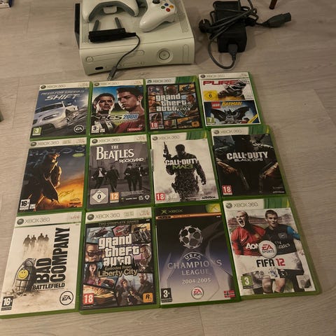 Xbox 360 slim med kamera og ekstra kontrollere