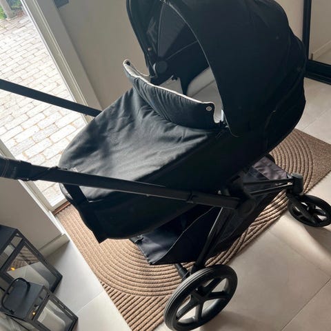 - Sittedel med nyfødtpute, sovepose, vindtrekk, parasol, håndtak i kunstskinn.