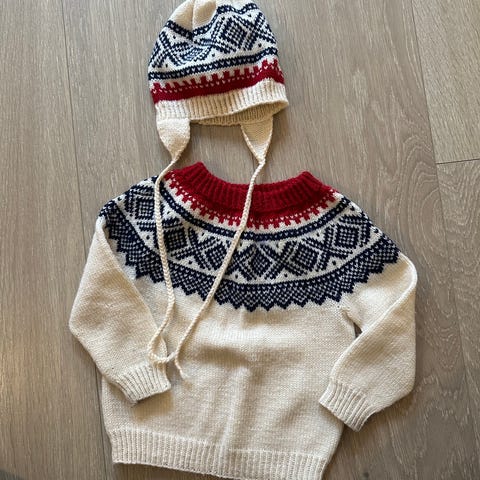 Strikka blå Mariusgenser og lysegrå ribbestrikka bukse. En liten flekk på høyre kne. Følger også med en søt bjørnelue m/hals.
