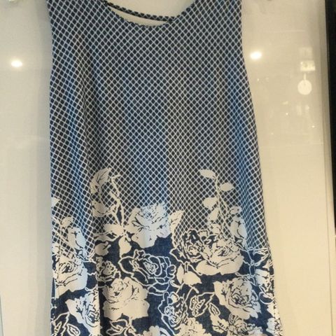 Uvanlig ermeløs topp, lys risa med detaljer i jeans , bomull, stretch. Lengde ga 54 cm, bredde på bryste ca 43 cm