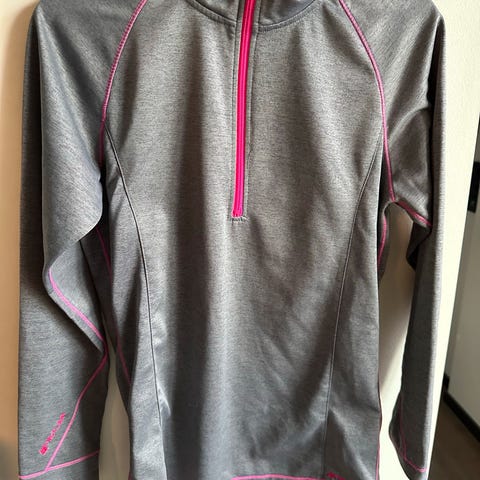 Kari Traa løping treningstrøye for dame i størrelse XL. Trøyen har lys grønn farge og er laget i et materiale egnet for sport og trening. Den har lange ermer, glidelåslommer bak, og en kort glidelås i front for ventilasjon.Passer nok en M,liten L.Fin mintgrønn farge.
