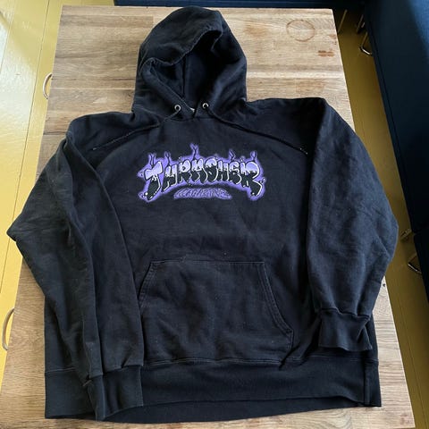 Hettegenser i kraftig bomull - tror det er damestørrelse L. Rosa trykk Thrasher foran.