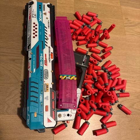Nerf Modulus blaster i hvit, grønn og oransje farge med avtakbart sikte og ekstra magasin. Leveres med flere skumgummikuler (piler). Egnet for barn og samlere av Nerf-produkter.