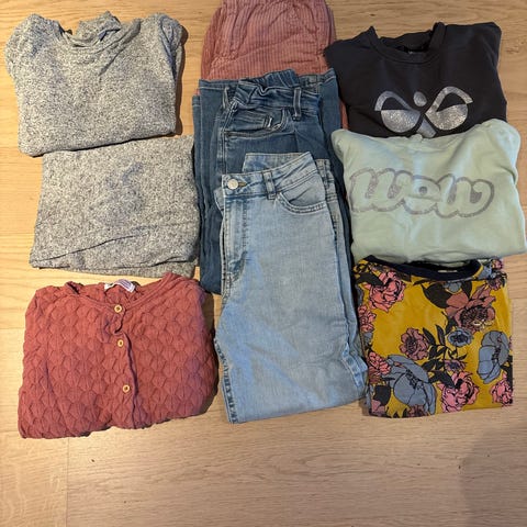 Stor klespakke til jente ca str 9-11 år. Jakke fra Gina Tricot samt jeans, velour joggedress, bluser og kjole fra Gina, skjørt fra Name It, gensere fra KappAhl og Lindex. Alt kjøpt nytt og pent brukt av en liten jente.