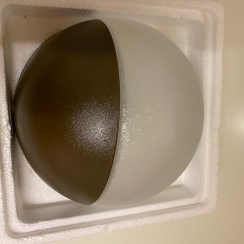 Vegglampe, ca 70-tallet, halv kule, diam. ca 20 cm, dybde/bygger ca 12 cm. Glasskuppel, klar, røykfarget
