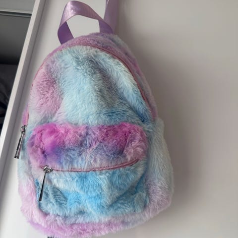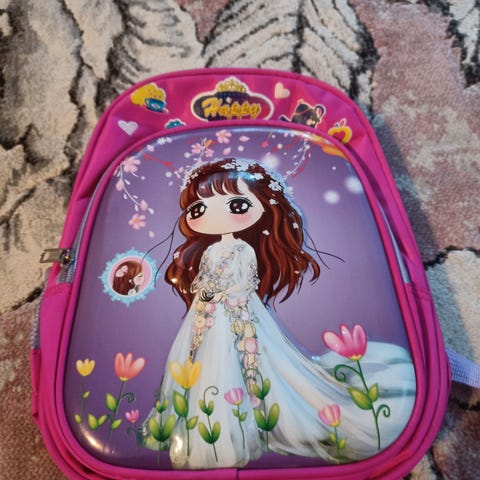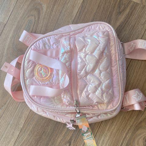 Saccosekk i rosa med håndtak. Lite brukt. Har et lite hull i sømmen.