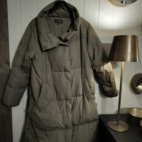 KappAhl parkas/dynekåpe i fargen sten-grå, størrelse M 38-40. . Toveis glidelås og trykknapper, samt avtagbar hette. Knelang. Lett. God og varm.