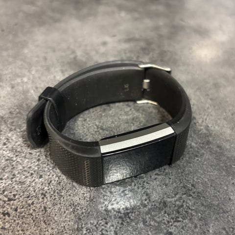Enheten har en rektangulær skjerm og justerbar stropp med spenne i metall. Designet for å måle puls og aktivitetsnivå, egnet for daglig bruk og trening.