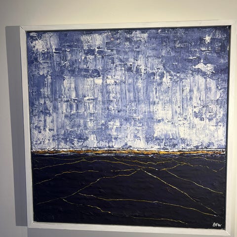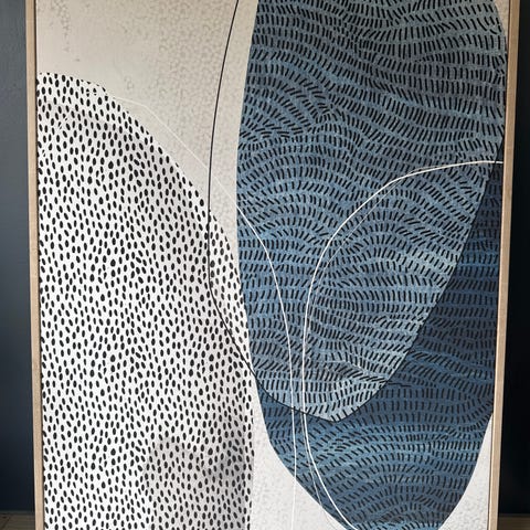 Abstrakt kunstverk som veggdekorasjon i svart og blå farger. Trykket/lerretet er i sort ramme