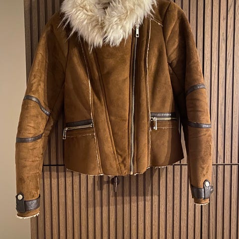 River Island Andre jakker i størrelse S for kvinner, svart farge. Jakken har glidelås og et design med teksturert materiale og pelsdetaljer på krage, mansjetter og nederkant.