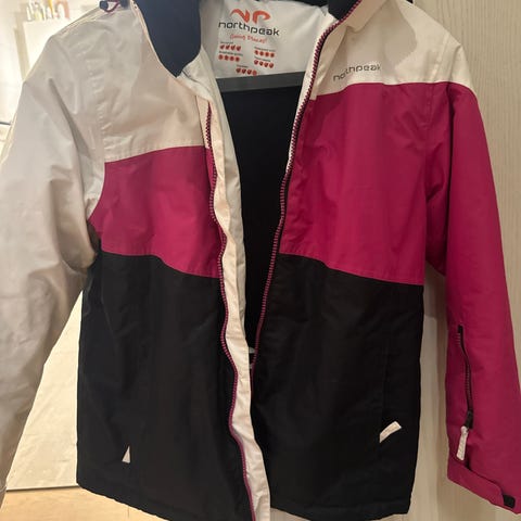 Hvit/multifarget, en løs søm ved den ene lomma, der mangler også glidelåsen en avtrekker, men glidelåsen fungerer.