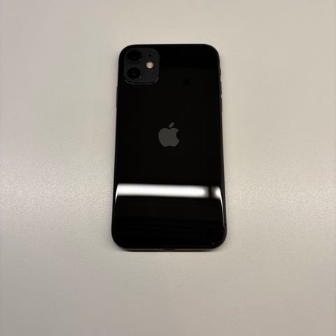 Apple iPhone 11 mobiltelefon med 128 GB lagringskapasitet. Enheten har hvit farge og glass- og aluminiumsdesign. Telefonen har to kameraer på baksiden og en skjerm med svart front. Passer for brukere som ønsker en smarttelefon med middels lagringsplass. Skjermen forran er delvis knust men ikke noe gigantiske skader