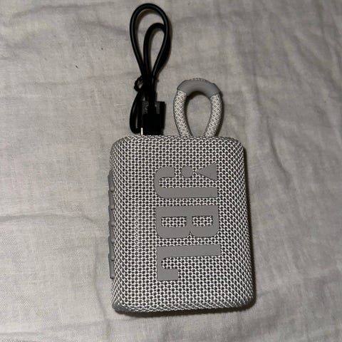 JBL GO Essential Bluetooth-høyttaler i svart farge. Kompakt og bærbar design med trådløs Bluetooth-tilkobling. Egnet for bruk med ulike enheter for lydavspilling.