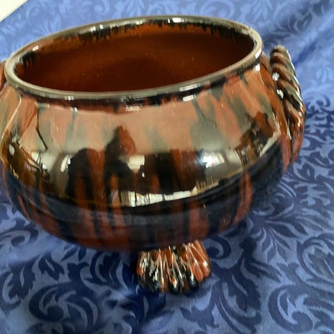 Håndlaget kinesisk porselen. Den en hanken er reparert. Bredde 55 cm, dybde 35, 21 cm høy.
