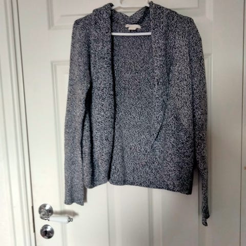 Brukt et par ganger. Jakken er svart med hvite sjateringer. Uten knapper og har 2 lommer. Glitterflak på hele jakken. Polyester, akryl og metall garn