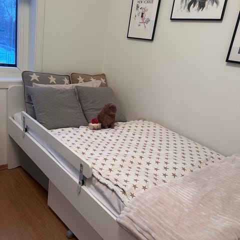Sengen har oppbevaringsskuffer under for ekstra lagringsplass. Den ene skuffen har inndeling, den andre er bare åpen.