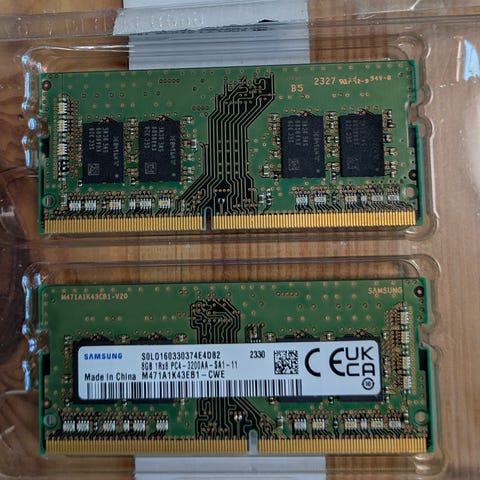 Samsung DDR5 16GB (2x8GB) SSO DIMM RAM-moduler med en hastighet på 5600 MT/s. SO DIMM RAM er brukt i laptopper og noen mini PC’er.