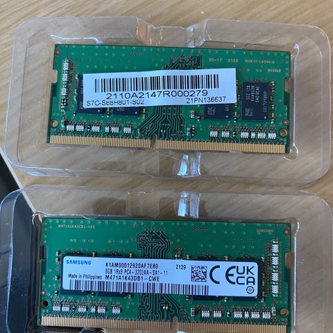 Samsung DDR5 16GB (2x8GB) SSO DIMM RAM-moduler med en hastighet på 5600 MT/s. SO DIMM RAM er brukt i laptopper og noen mini PC’er.