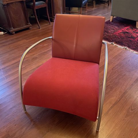 To stk lenestoler i skinn i en burgunder farge. En stk puff medfølger.
