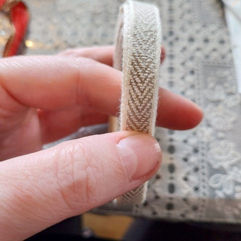 Bomulls kant bånd ferdig til å sette på. 89,5 cm lang. 6 cm bred. God og myk elastisitet. Har ligget ubrukt. For å skifte ut utslitt ribbebånd på ermene. Denne remsen er lang og kan gi flere når deler opp. Praktisk lys grå farge som kan passe flere farger.., kan og sendes som brev / brevporto..,