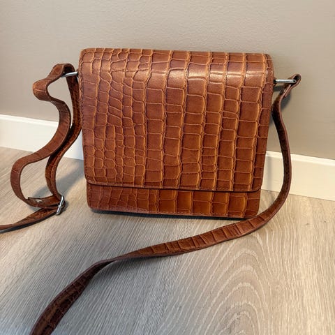 Krokodilleskinn veske, rektangulær form med klaff og skulderrem. Innvendig er det flere rom for oppbevaring. Vesken er egnet for daglig bruk og har et klassisk design.. Vesken er enten laget av krokodille skinn eller slangeskinn? Den er ca 23 cm høy, 31 cm bred, hanken er 90 cm. Jeg kan levere i Oslo, Drammen, Moss mm.