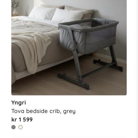 Babybay Bedside Crib i grå farge. Sengen er designet for å plasseres ved siden av voksenes seng, noe som gir enkel tilgang til barnet. Laget med materialer som gir komfort og sikkerhet for spedbarn.