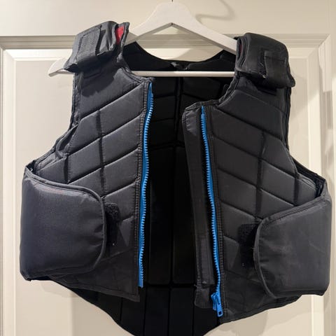 Blazon Horse beskyttelsesvest i svart farge. Hel og pen ridevest fra Horze i str S (voksen). Vesten har snøring(vesten enkelt kan tilpasses) og glidelås foran. Ridevesten passer for unisex bruk.