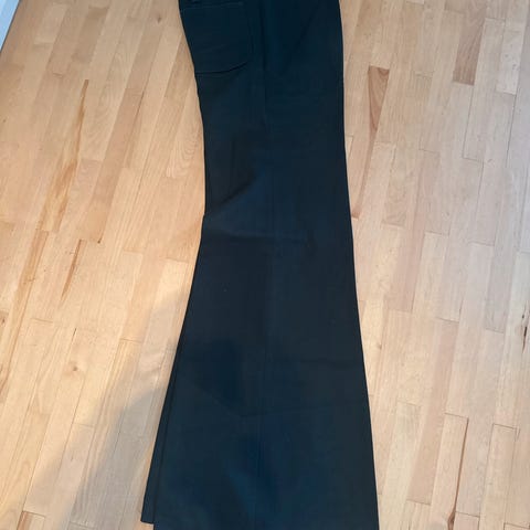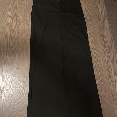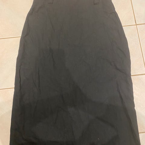 Svart skjørt for kvinner i størrelse M. Skjørtet har en enkel design uten mønster, med knapp- og glidelåslukking foran. Materialet er ikke spesifisert, men det har en glatt overflate og et klassisk snitt.
