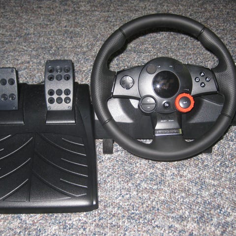 Logitech Driving Force ratt og pedaler i svart. Inkluderer ratt med tilkoblingskabler, tre pedaler og girspak. Designet for bruk med racing- og kjøresimulatorspill. Kompatibel med PC og konsoller som støtter Logitech g25.