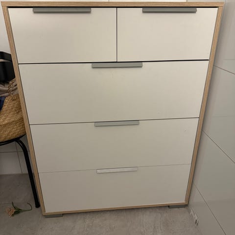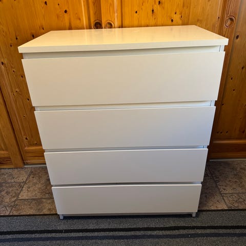 Selges som den er. Var opprinnelig hvit. Er malt beige. Trenger kanskje en ny runde maling, noen sår på skuffer. Kan lett pusses og males på nytt.